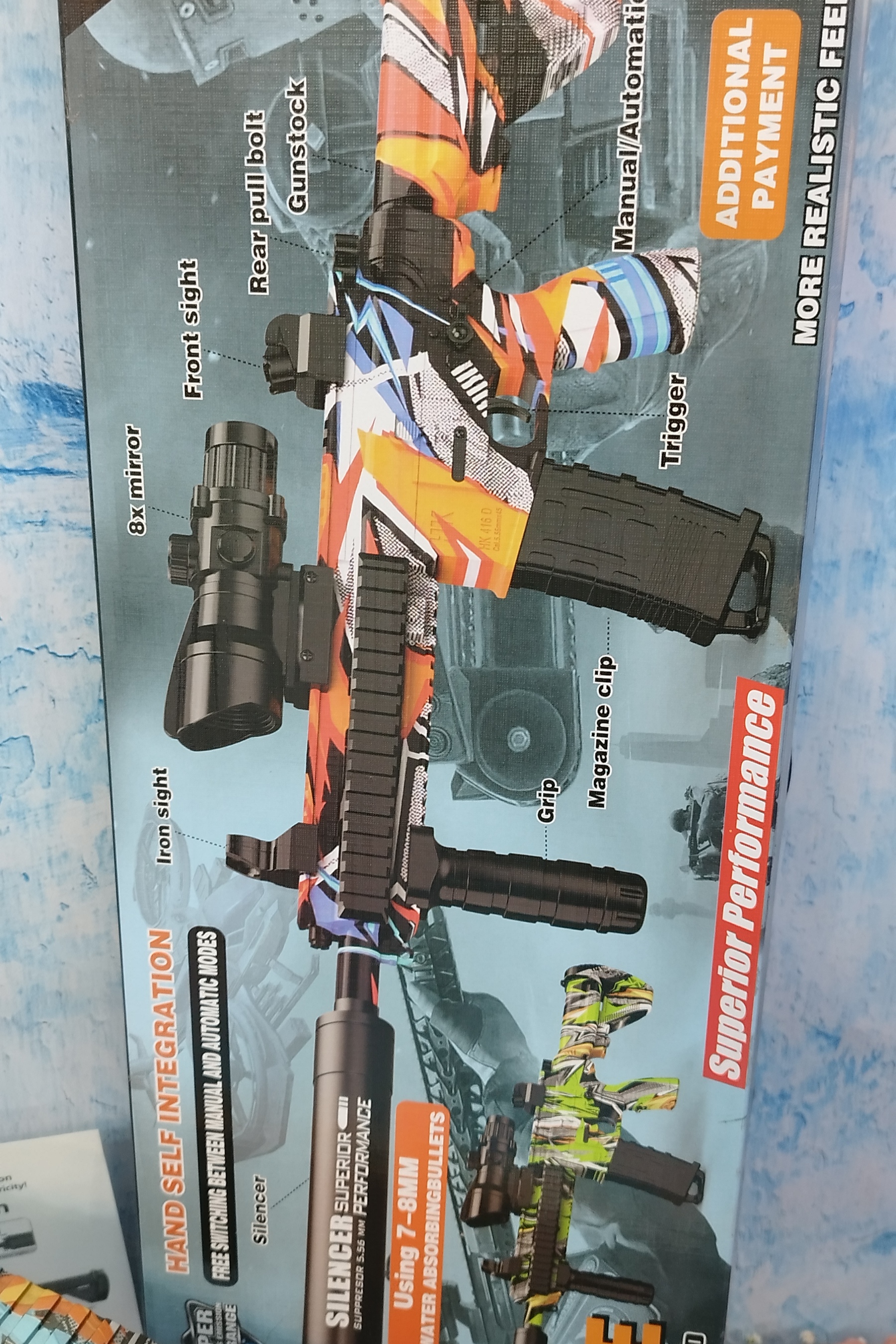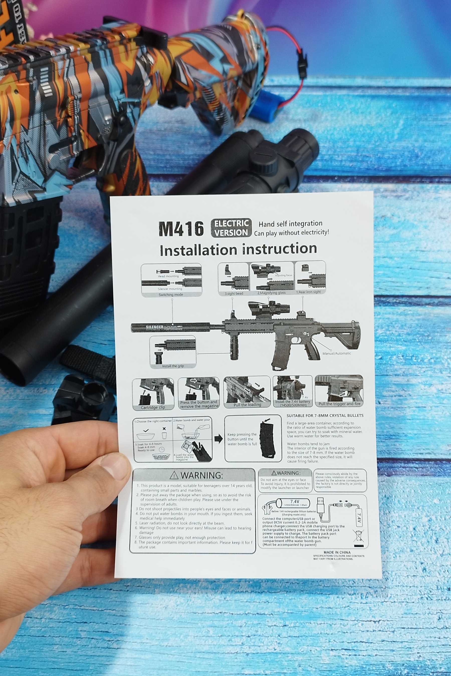 تفنگ ام 416 دارای طراحی مدرن و زیبا با رنگهای جذاب است. بدنه این تفنگ از پلاستیک با کیفیت بالا ساخته شده و مقاومت خوبی در برابر ضربه دارد. همچنین، این تفنگ با استفاده از باتری کار میکند و قابلیت شلیک خودکار با تیرهای ژلهای 7-8 میلیمتری را دارد. این ویژگیها بازی با این تفنگ را بسیار هیجانانگیز و لذتبخش می
