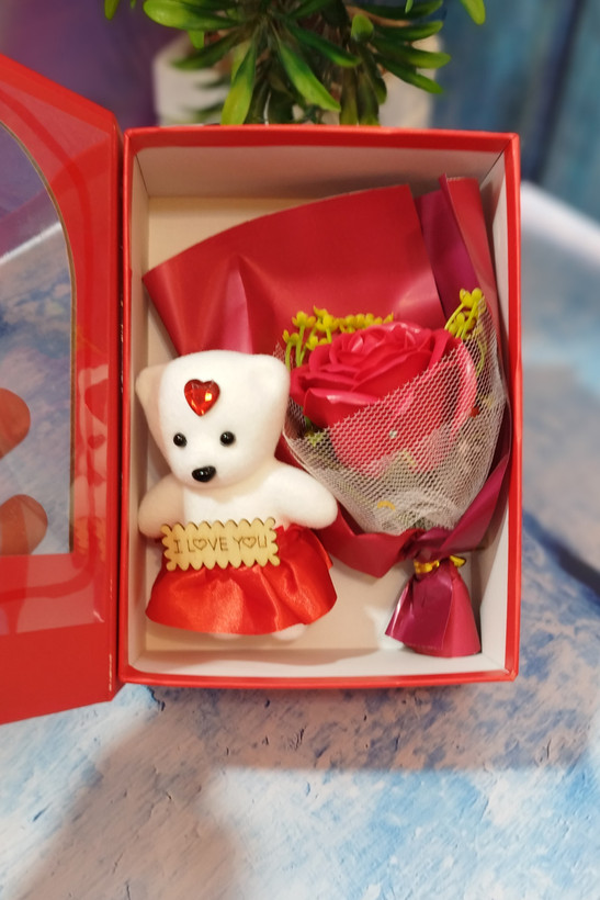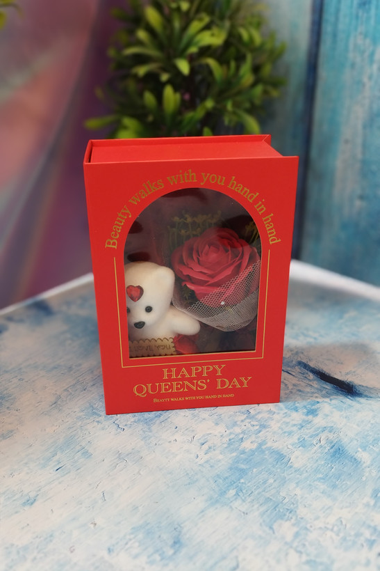 ویژگی محصول: دارای یک عدد خرس ۱۰ سانت و یک گل تزیین شده